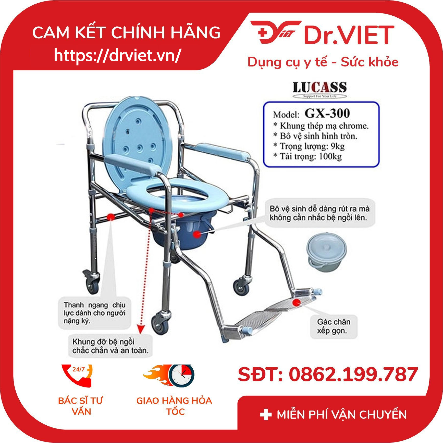 – Ghế bô vệ sinh có bánh xe Lucass GX300 có tải trọng 100kg tựa như một chiếc xe lăm giúp người ngồi di chuyển vị trí khi đi vệ sinh