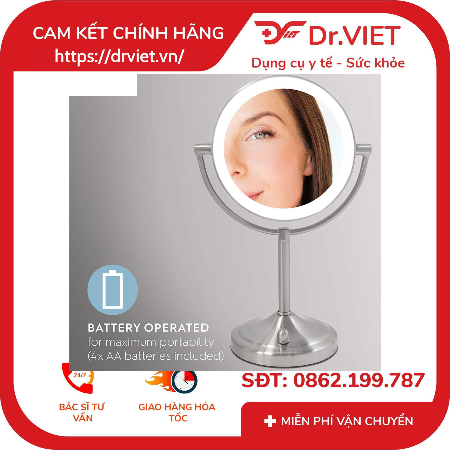 Gương trang điểm 2 mặt kèm đèn Led HoMedics MIR-8150-EU với Đèn Led chiếu sáng dễ dàng điều chỉnh được cường độ ánh sáng bằng núm vặn xoay, sẽ tạo ra mức ánh sáng lý tưởng cho mọi thời điểm trong ngày khi trang điểm. Vì nó hoạt động bằng pin nên nó hoàn toàn di động để bạn có thể sử dụng hoặc đặt nó bất cứ nơi nào thuận tiện nhất. Bóng Led sử dụng 4 pin AA dễ mua ngoài cửa hàng, siêu thị, thay thế pin đơn giản. Đèn Led cho tuổi thọ cao hơn và tiêu thụ pin thấp. Gương trang điểm HoMedics thiết kế phần chân đế chắc chắn. Khung và chân đế đều được làm bằng kim loại Niken cao cấp, độ sáng bóng cao, bền bỉ, cứng chắc. Bóng Led nhìn không bị lóa và không có bóng. Gương có thể xoay 360 độ rất tiện dụng khi dùng. Với những ưu điểm trên thì gương trang điểm HoMedics chính là lựa chọn tuyệt vời dành cho bạn, giúp bạn trông xinh đẹp và hoàn hảo hơn trước khi ra ngoài.