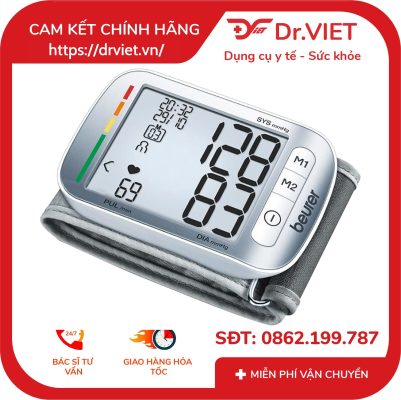 Máy đo huyết áp cổ tay Beurer BC50 đo huyết áp tối đa (tâm thu), đo huyết áp tối thiểu (tâm trương), đo nhịp tim, cảnh báo nhịp tim bất thường.  BC50 Tự động cảnh báo thao tác sai khi đo huyết áp, dùng được cho các bệnh nhân máu nhiễm mỡ và xơ vữa động mạch.