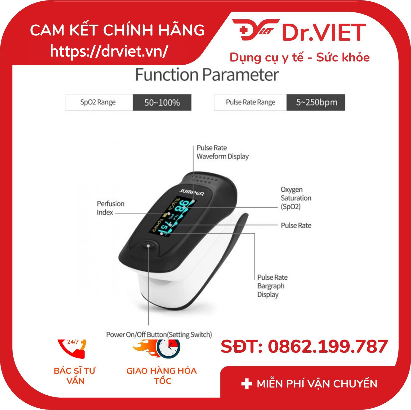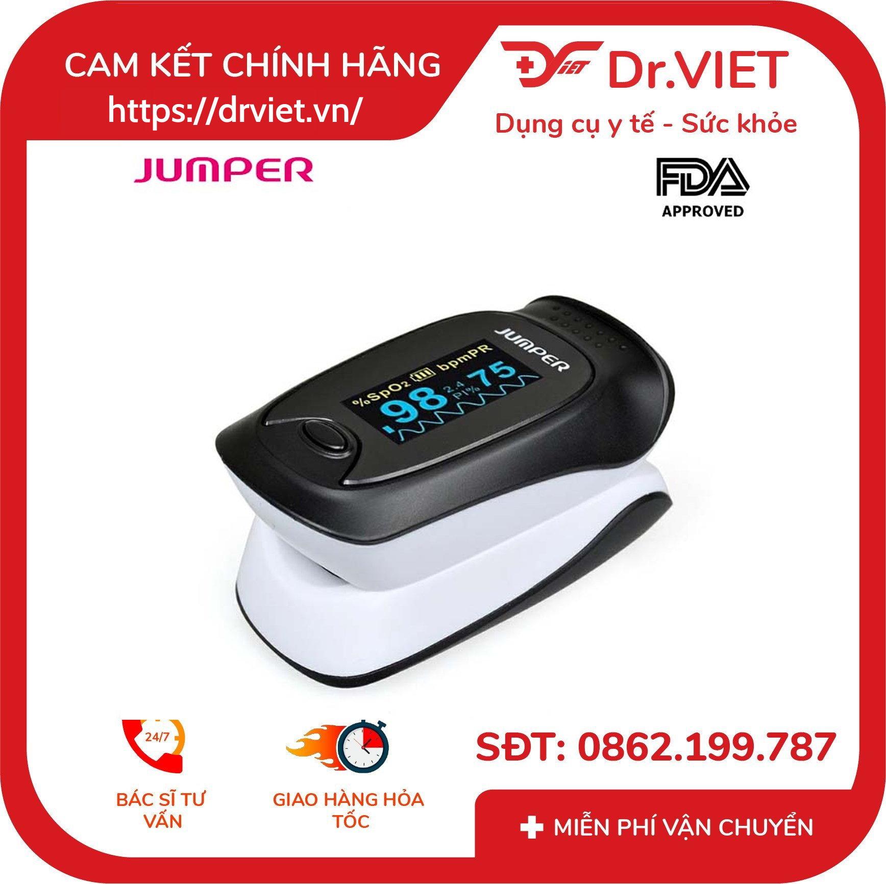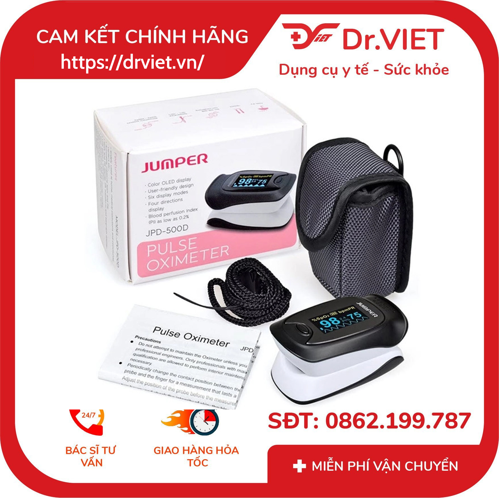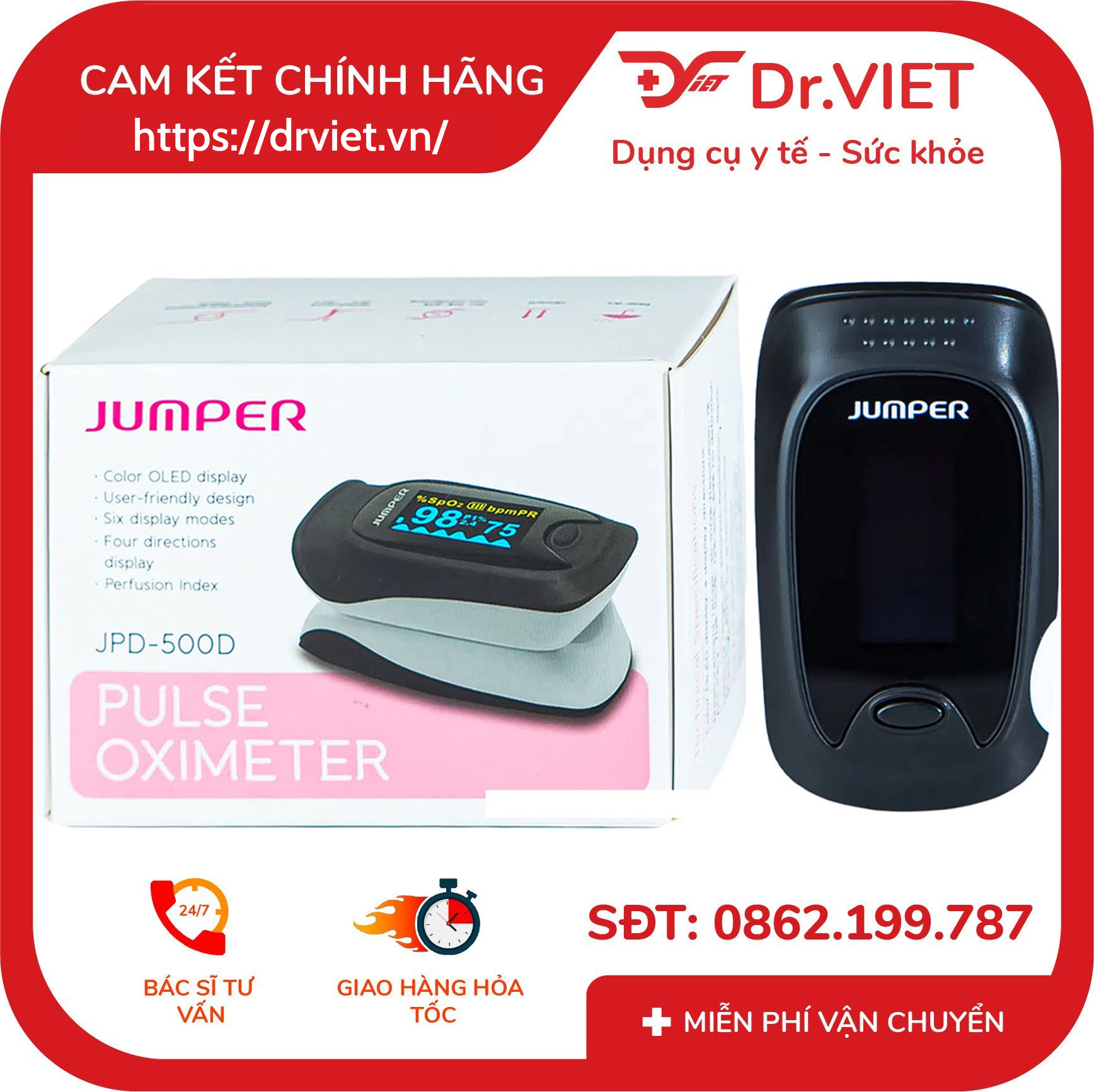 Máy nhỏ gọn, nhẹ, dễ mang theo, thao tác đơn giản bằng một nút bấm. Ngoài ra, thiết bị sẽ tự động tắt nguồn sau 10 giây không sử dụng nhằm tiết kiệm pin và tăng độ bền. Máy đo SpO₂ Jumper JPD-500D là thiết bị lý tưởng cho mọi gia đình, đặc biệt với người lớn tuổi, người có bệnh mãn tính, vận động viên hoặc người đang phục hồi sau ốm. Việc theo dõi SpO₂ và nhịp tim đều đặn giúp bạn kiểm soát tình trạng sức khỏe, phát hiện sớm nguy cơ và chủ động can thiệp kịp thời. Jumper Medical Equipment Co., Ltd là thương hiệu thiết bị y tế uy tín toàn cầu, với hơn 20 năm kinh nghiệm trong lĩnh vực nghiên cứu, phát triển và sản xuất các sản phẩm chăm sóc sức khỏe gia đình. Thương hiệu này nổi bật với hệ thống kiểm soát chất lượng nghiêm ngặt và đã đạt được nhiều chứng nhận quốc tế khắt khe về an toàn và hiệu quả. Jumper Medical hiện sở hữu hơn 100 bằng sáng chế và bản quyền liên quan đến thiết bị y tế, đồng thời đầu tư mạnh mẽ cho đổi mới công nghệ với 3 trung tâm nghiên cứu và phát triển (R&D) đặt tại châu Âu và Hoa Kỳ, nhằm đảm bảo sản phẩm luôn tiên tiến và đáp ứng nhu cầu toàn cầu.