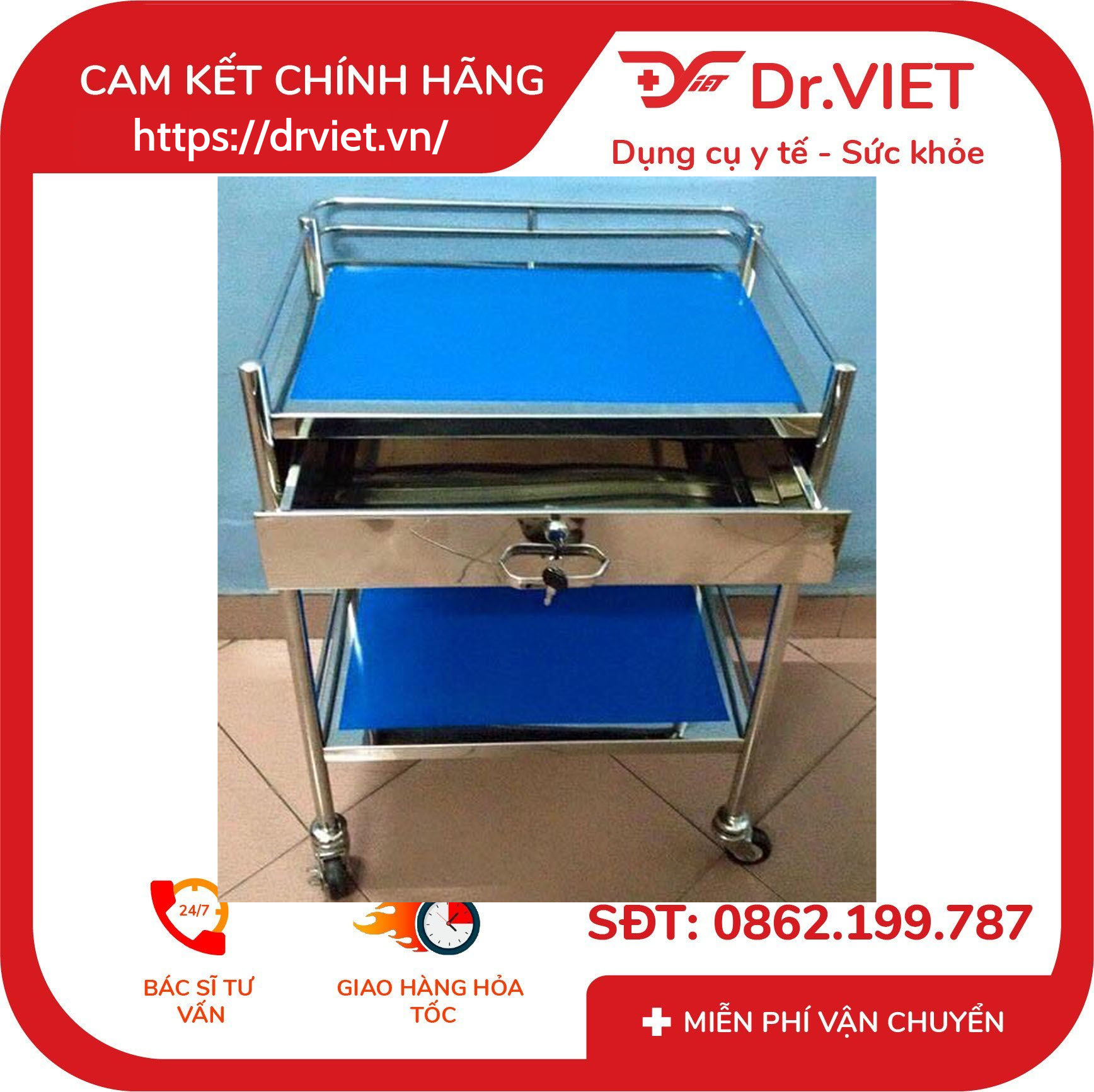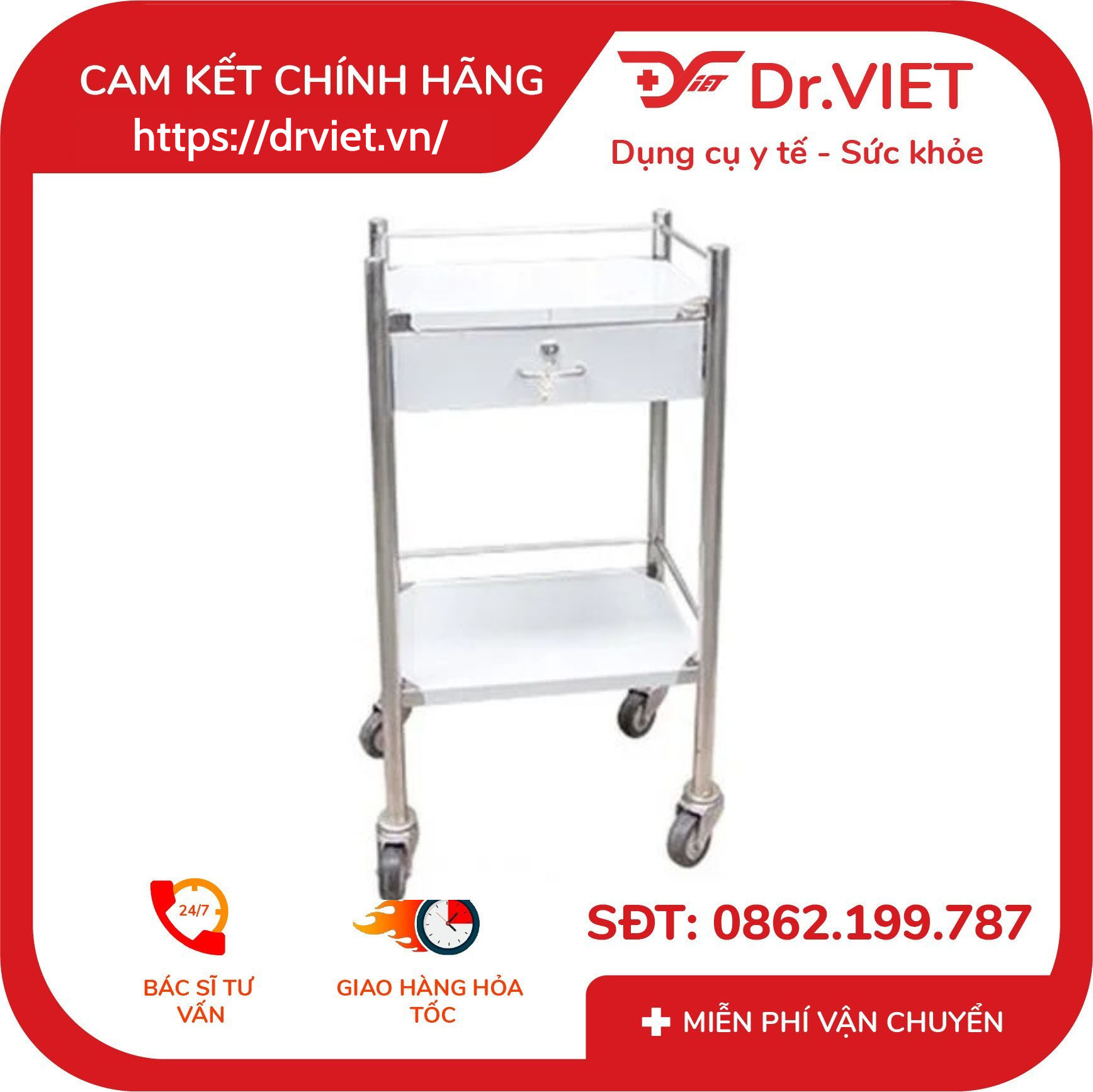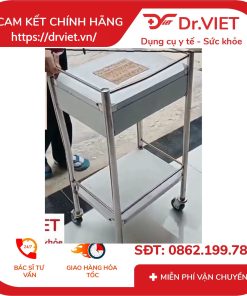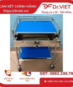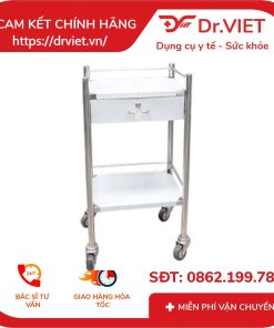 xe đẩy y tế, thẩm mỹ viện, phòng thí nghiệm nhỏ gọn, chất liệu Inox (thường là SUS 201 hoặc 304), có 2 tầng kệ kích thước 30×40 cm, một hộc kéo để đựng đồ và bánh xe di chuyển, được sử dụng phổ biến nhờ độ bền, dễ vệ sinh, giá cả phải chăng.