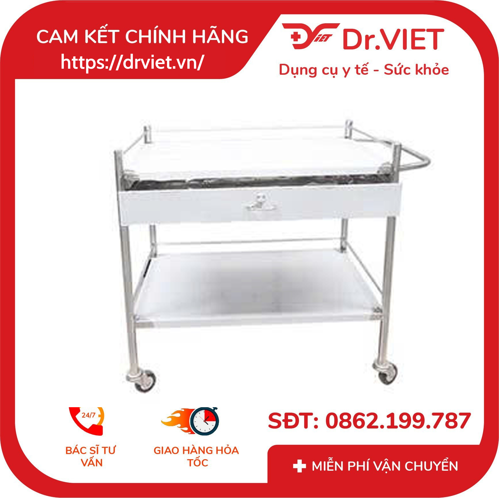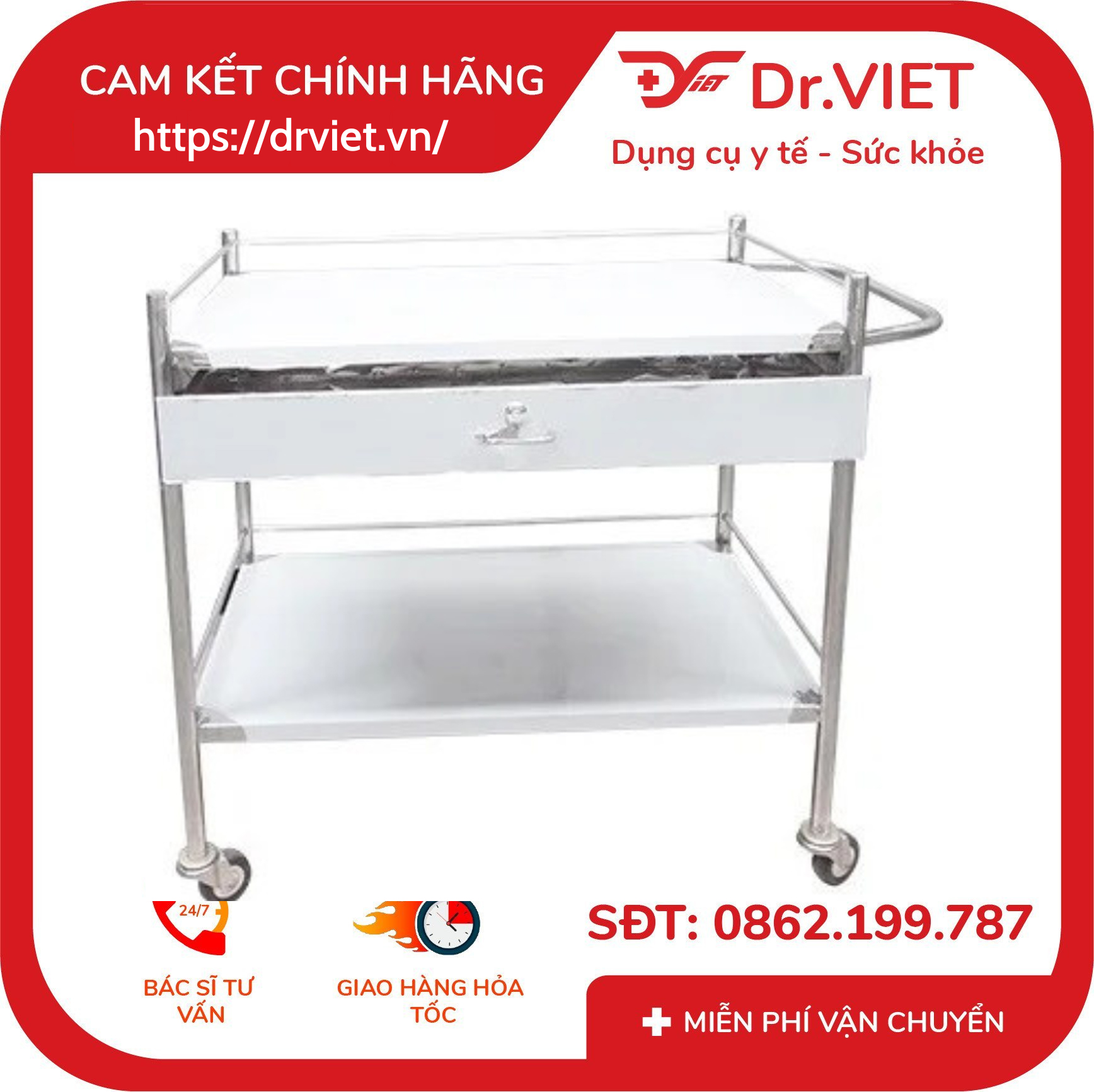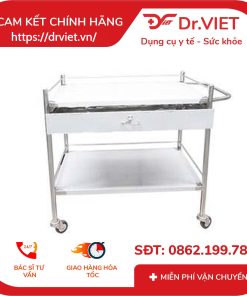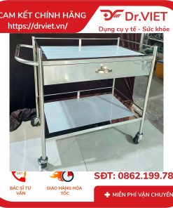 Xe đẩy Inox 50×80 2 tầng có hộc DCG38 thiết bị y tế chuyên dụng, làm từ inox bền bỉ (thường là inox SUS 201), có 2 tầng, có ngăn kéo (hộc) và tay đẩy tiện lợi, kích thước 50x80cm, thường dùng vận chuyển đồ vật trong bệnh viện, phòng khám, thẩm mỹ viện