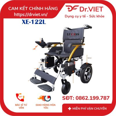 - Xe lăn điện Lucass XE-122L là dòng xe lăn điện được gia công và sản xuất bởi thương hiệu Lucass Mỹ, phần khung của xe được làm từ hợp kim nhôm siêu bền siêu nhẹ giúp cho quá trình di chuyển của người già người bệnh dễ dàng, và khi cần cất giữ xe có trọng lượng nhẹ nên rất dễ mang di chuyển du lịch hoặc làm hành lý bỏ lên xe khi di chuyển xa.
