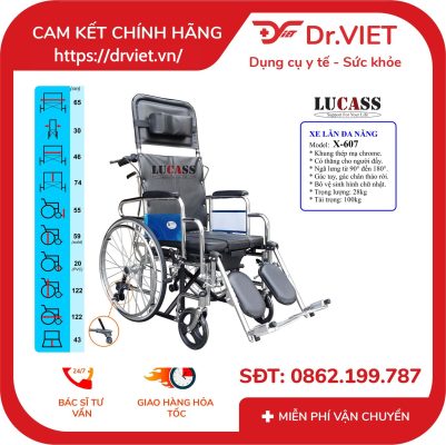 – Xe lăn đa năng Lucass X-607 có 2 tay đẩy phía sau, tay thắng ngả lưng để nằm và có thắng tay.